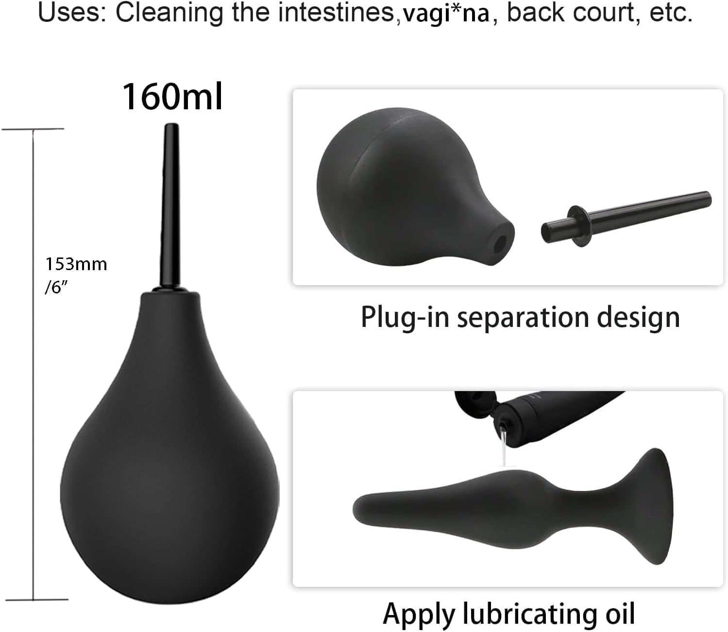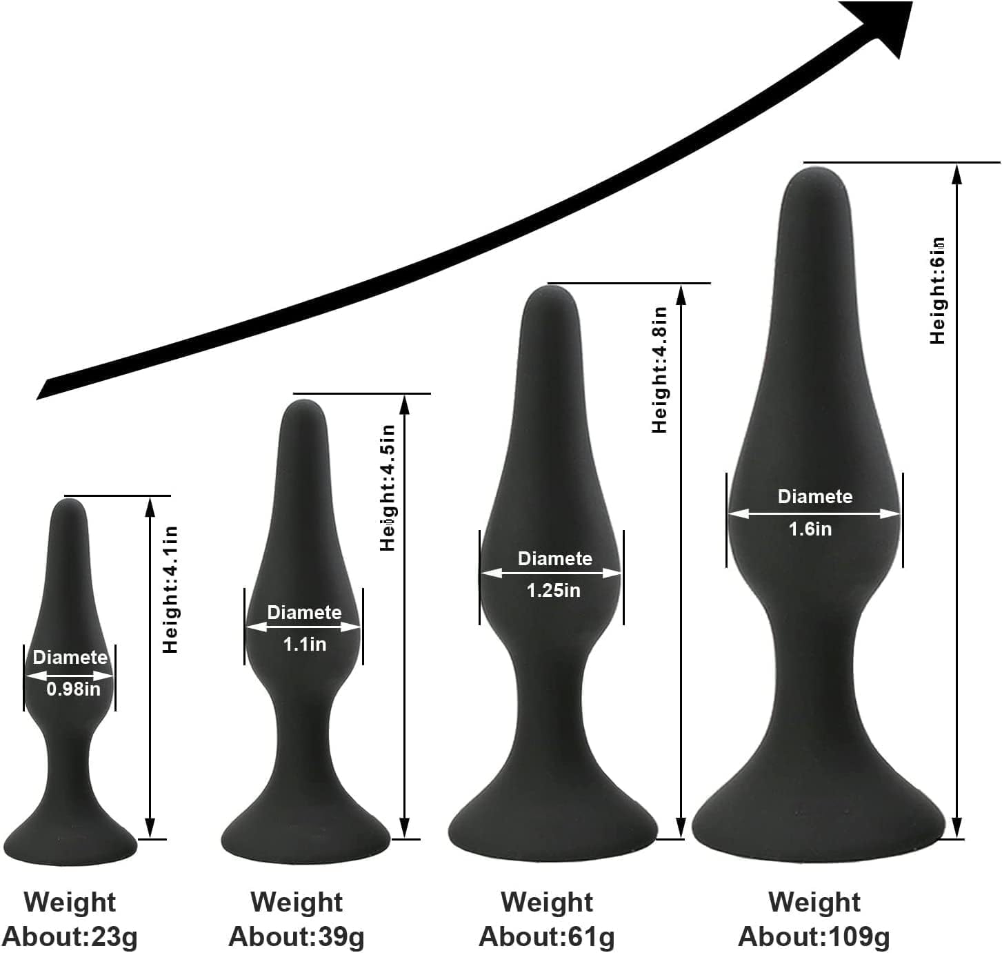 ※ 4 tailles de plugs anal- Petit 4 x 1 pouce, Moyen 4,5 x 1,12 pouce, Grand 4,8 x 1,25 pouce, X-Large 6 x 1,5 pouce ; Le paquet comprend 4pcs plug anal, Enema noir 150ml.
